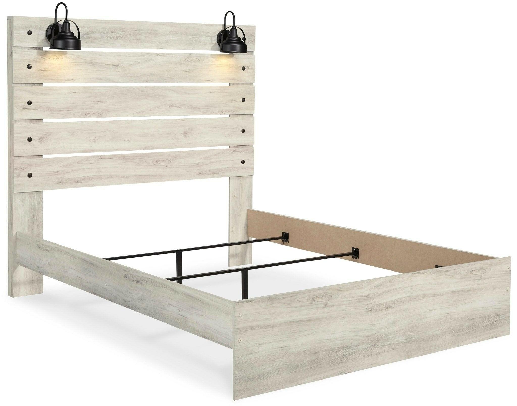 What a delightful take on rustic industrial style. Whether modern loft or modern farmhouse, this king panel bed makes itself at home. The wispy whitewash palette enhances without covering the grain for that weathered look you crave. Love to read in bed? You’re sure to find the retro-chic light sconces and USB plug-ins on the open-slat style headboard such a bright idea.