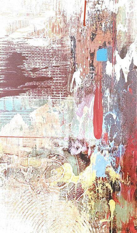 Description: Abstract gallery wrapped canvas wall art. Beige, green, browns, gray, blues, reds & white. Giclee reproduction. Sawtooth for hanging